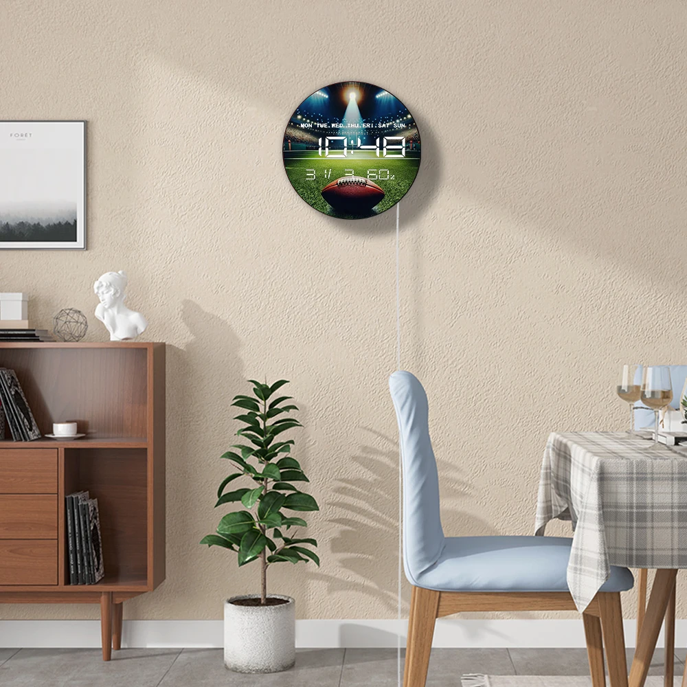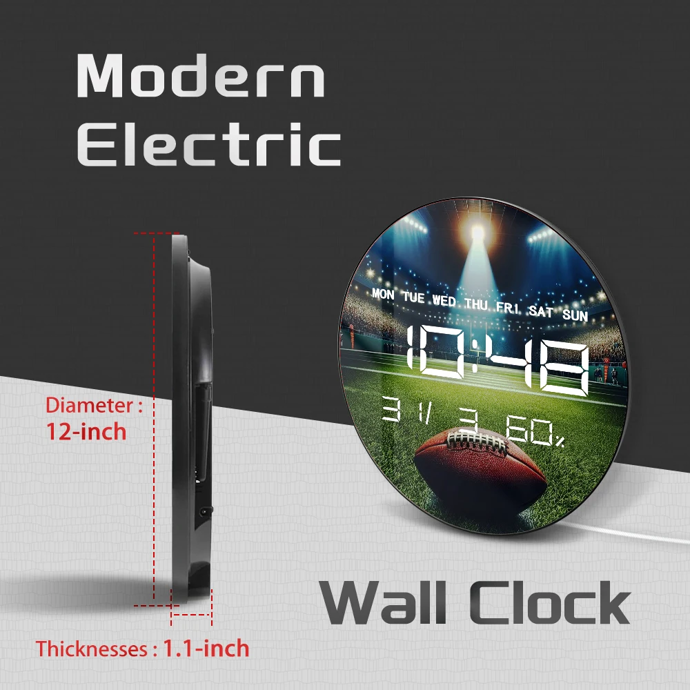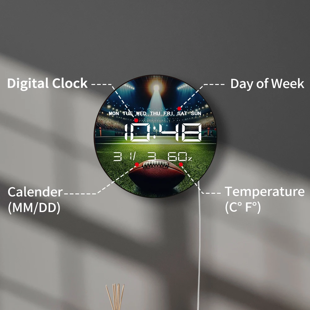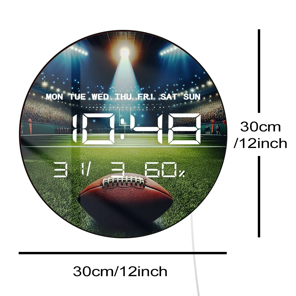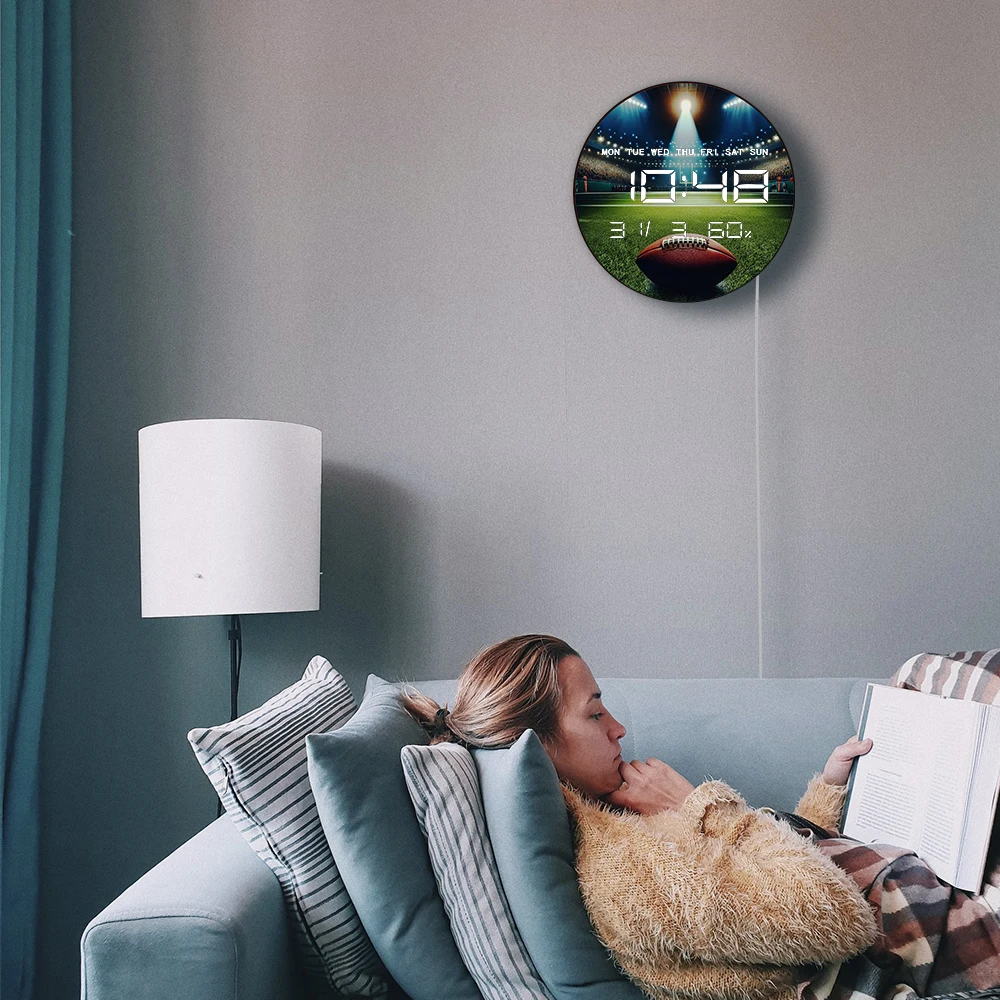 American Football Ball Digital Wall Clock with LED Display Calendar Temperature Auto Dimming 12/24hr Format Electric Wall Clock