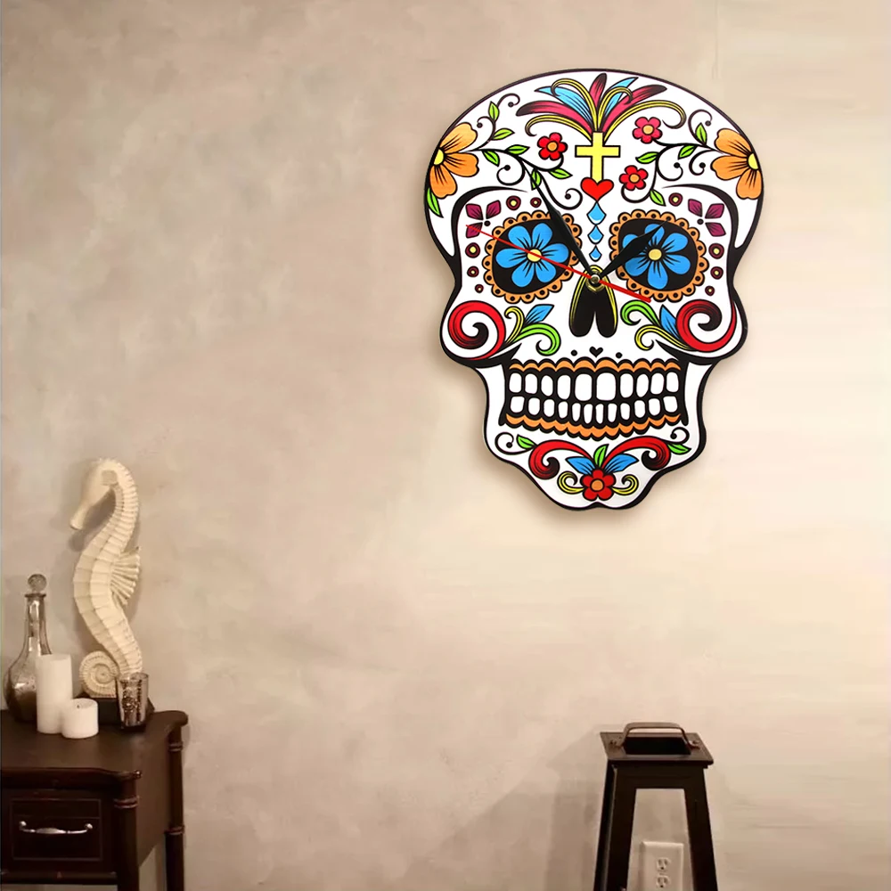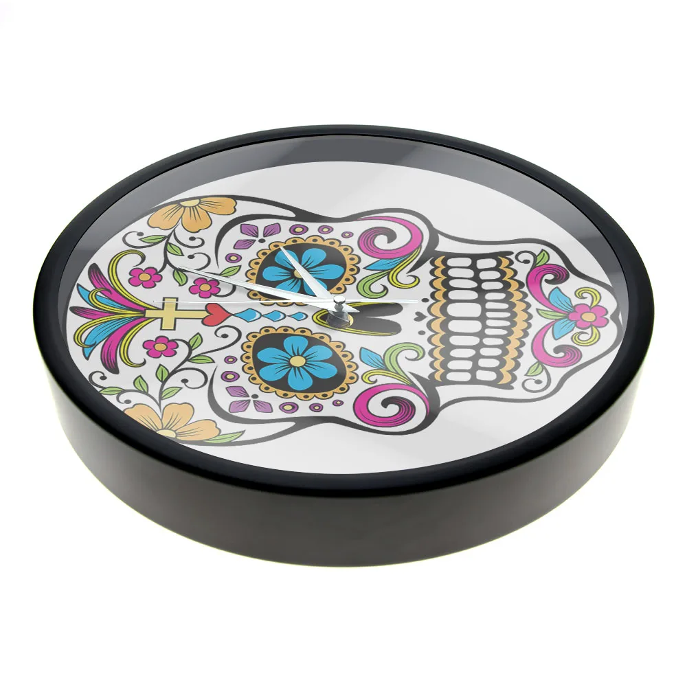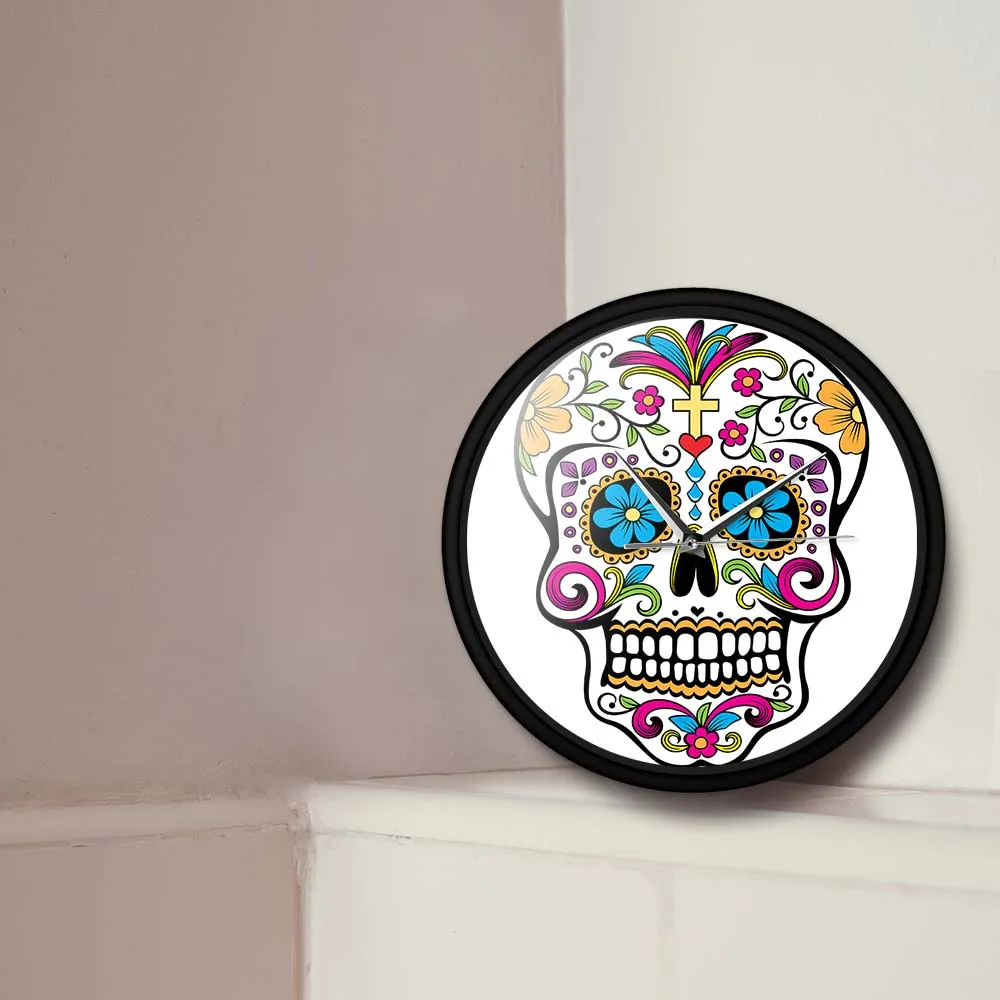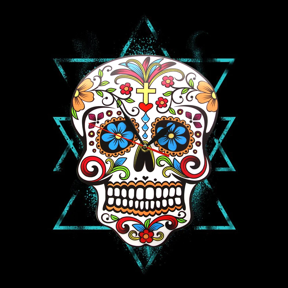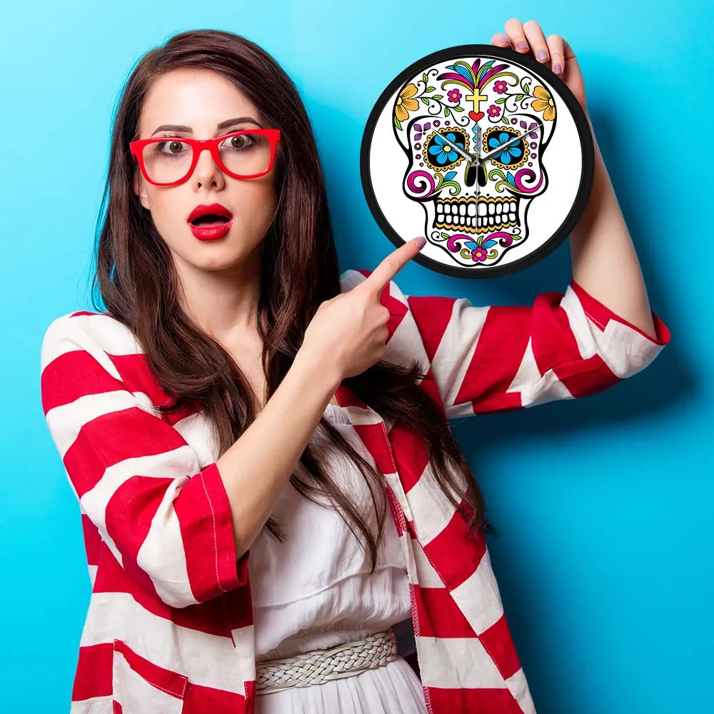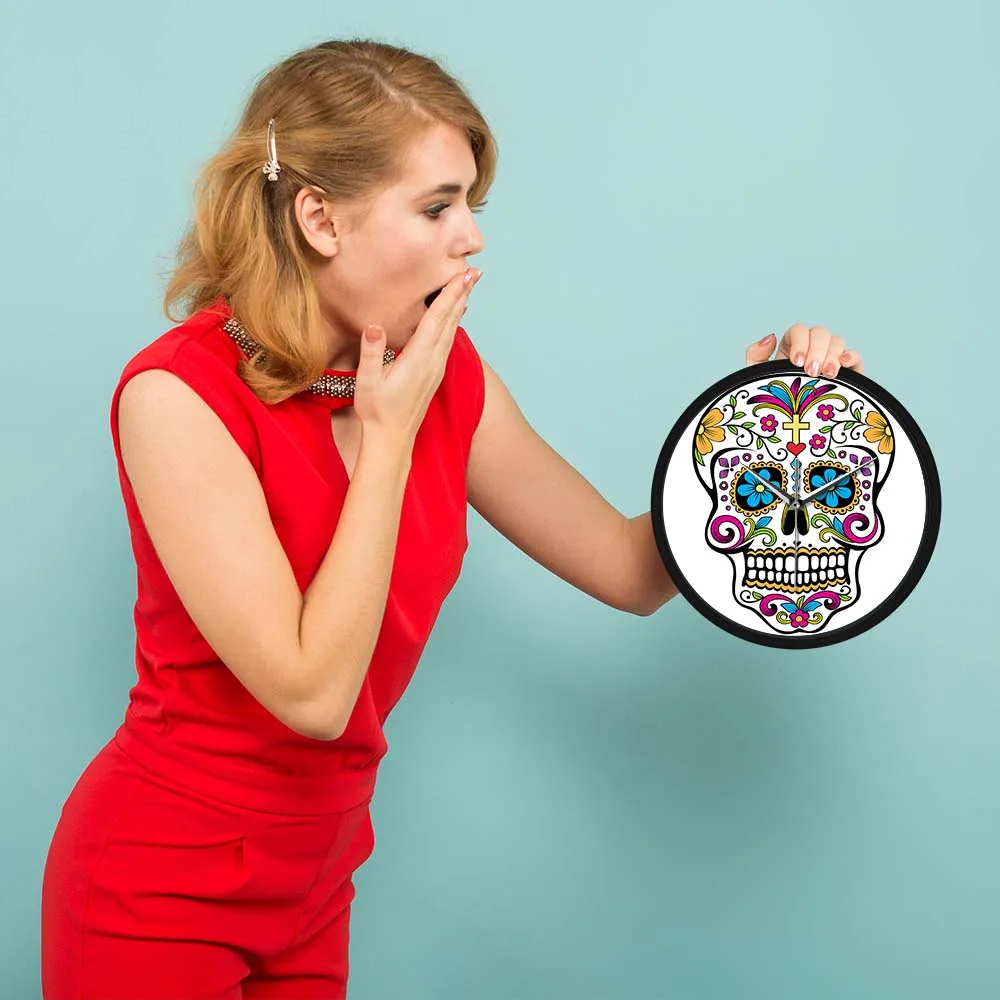 Become inspired by the Mexican Culture by featuring this Beautiful Sugar Skull Dia De Los Muertos wall clock in your home. Set on an acrylic laser engraved looking background, this colorful Day of the Dead reloj features a vibrant floral sugar skull image as the clock face.