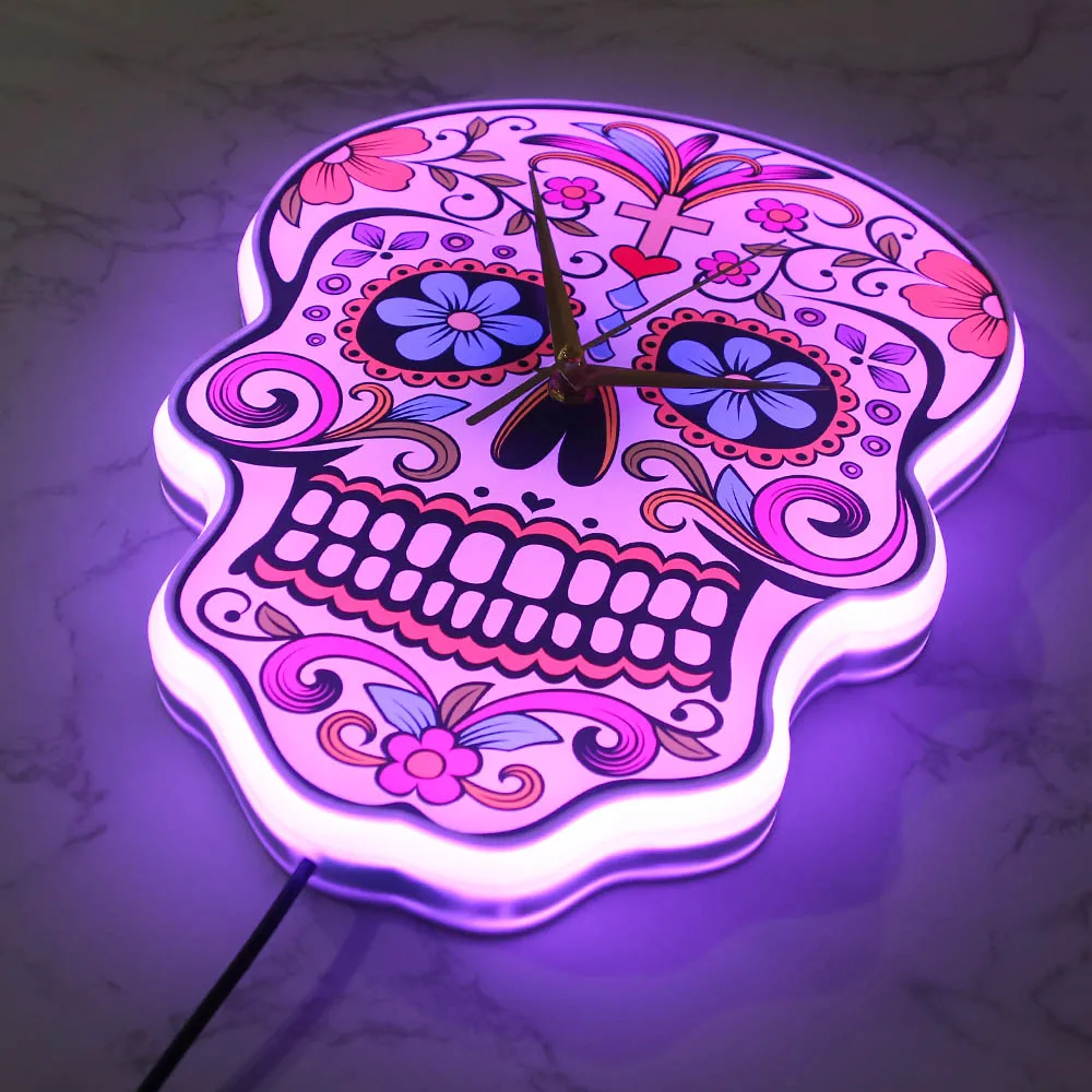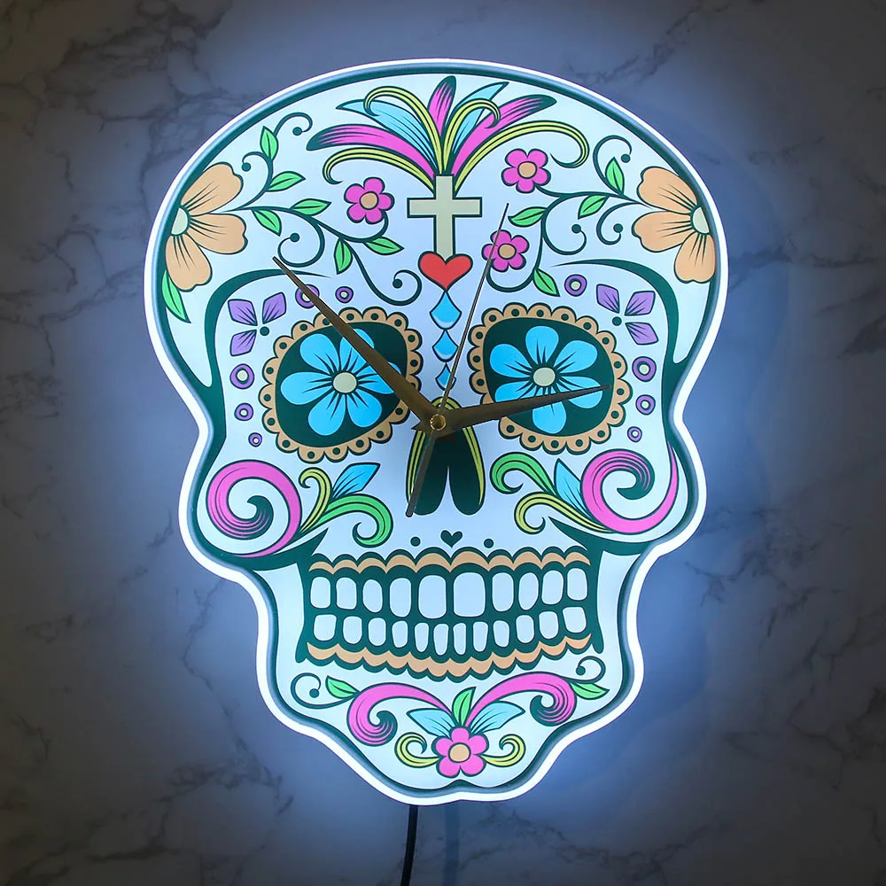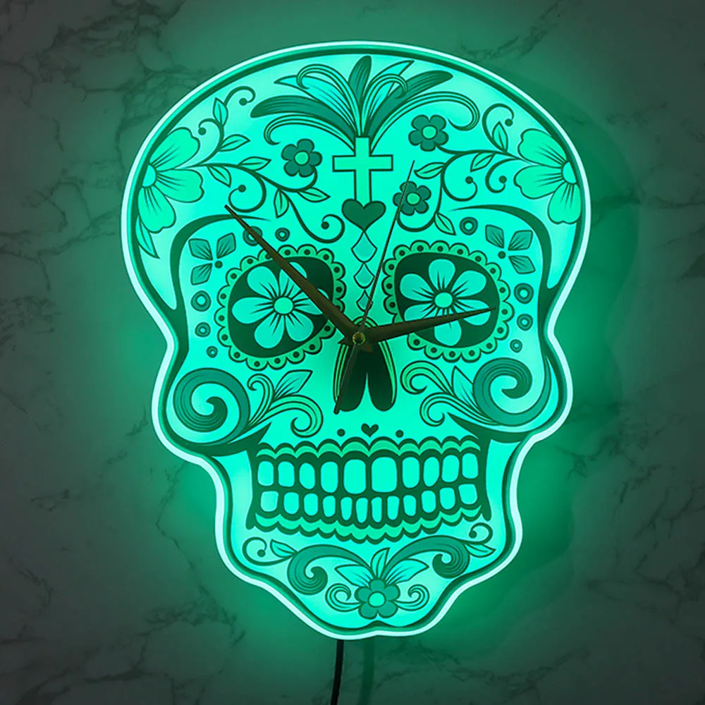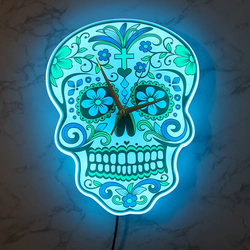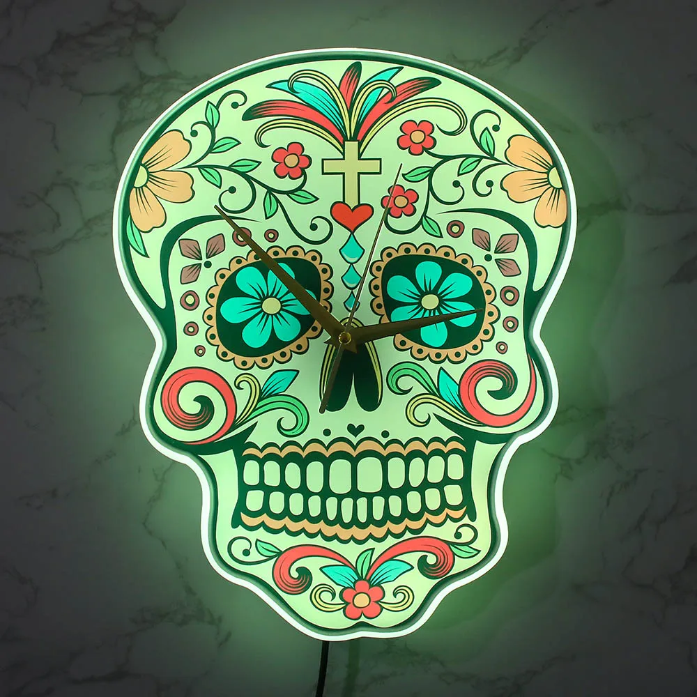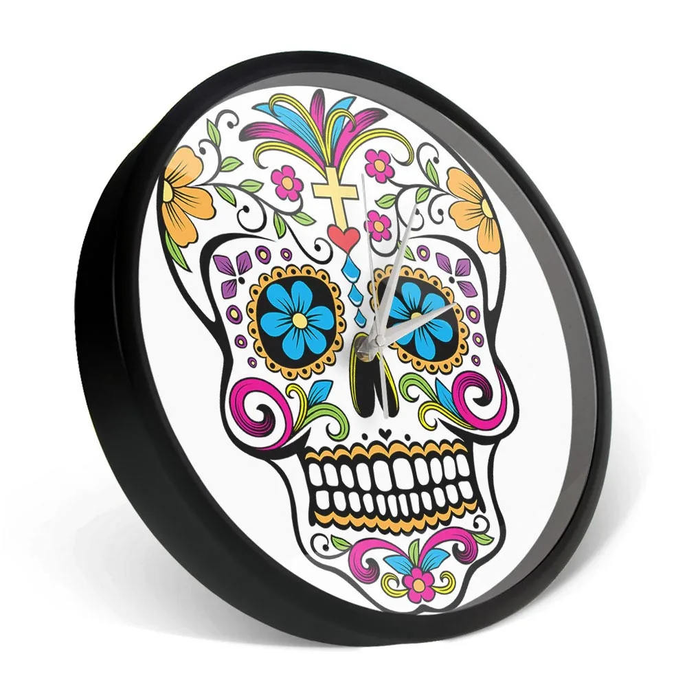 Become inspired by the Mexican Culture by featuring this Beautiful Sugar Skull Dia De Los Muertos wall clock in your home. Set on an acrylic laser engraved looking background, this colorful Day of the Dead reloj features a vibrant floral sugar skull image as the clock face.