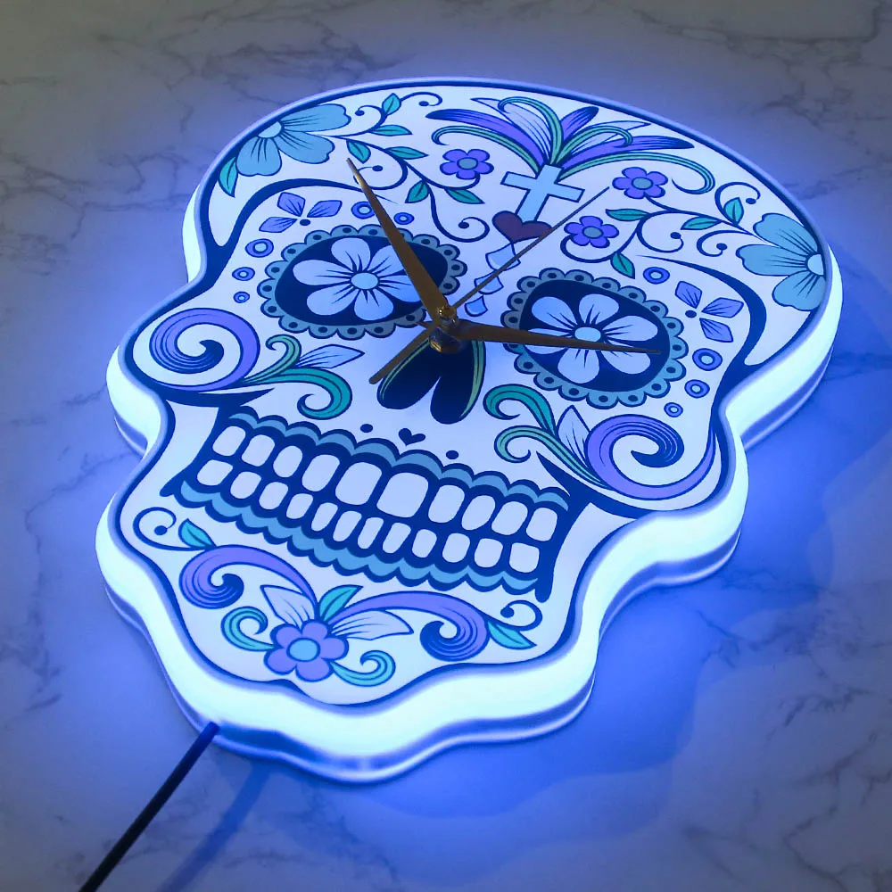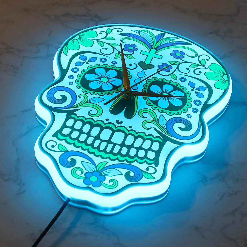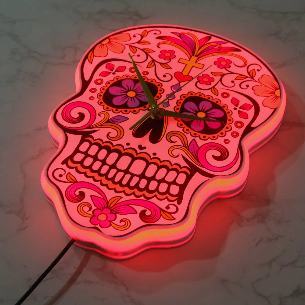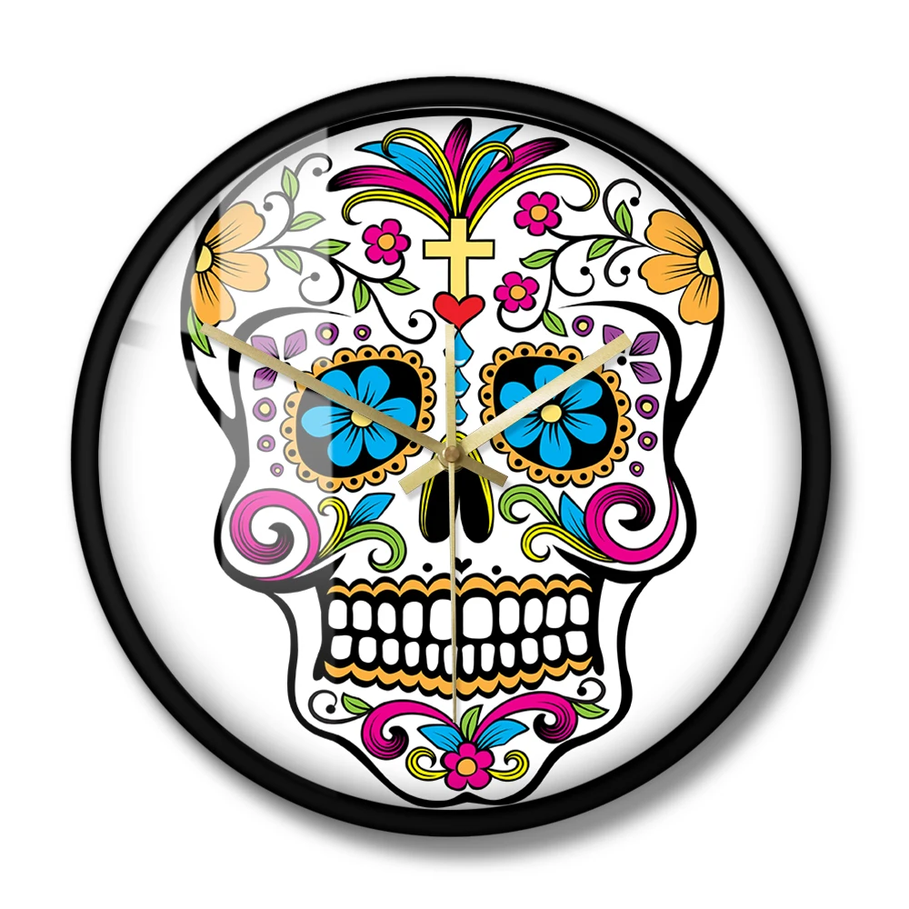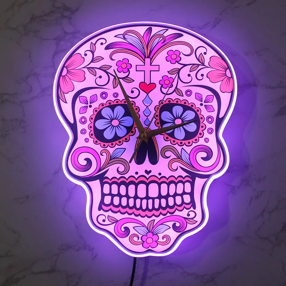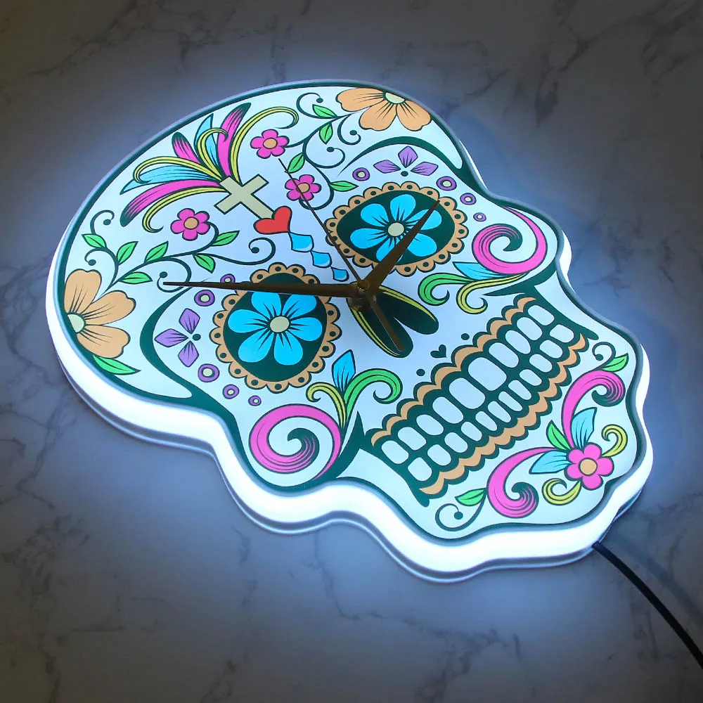Become inspired by the Mexican Culture by featuring this Beautiful Sugar Skull Dia De Los Muertos wall clock in your home. Set on an acrylic laser engraved looking background, this colorful Day of the Dead reloj features a vibrant floral sugar skull image as the clock face.