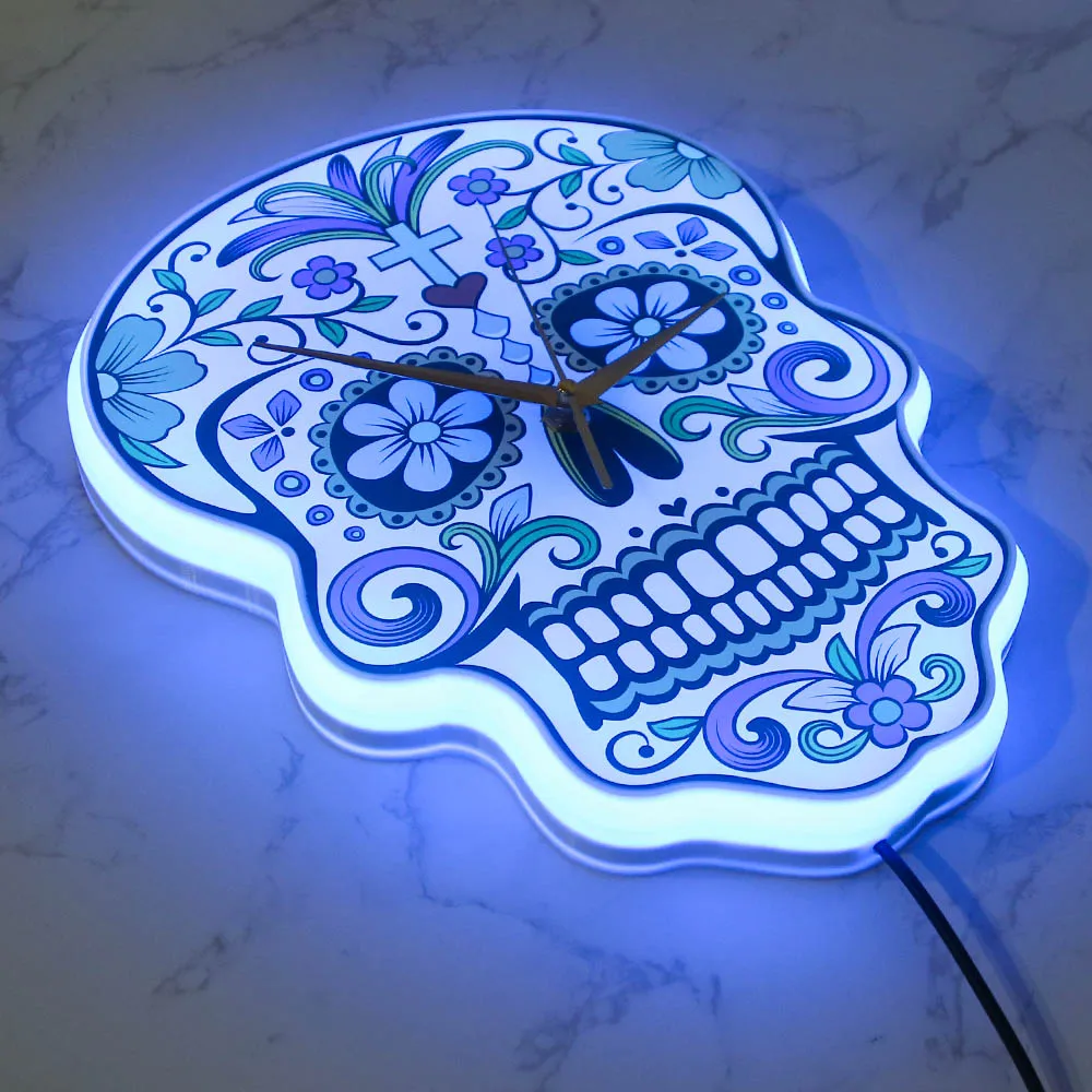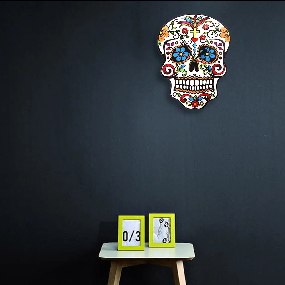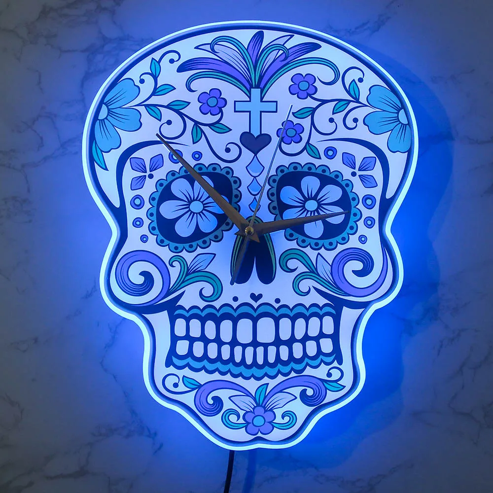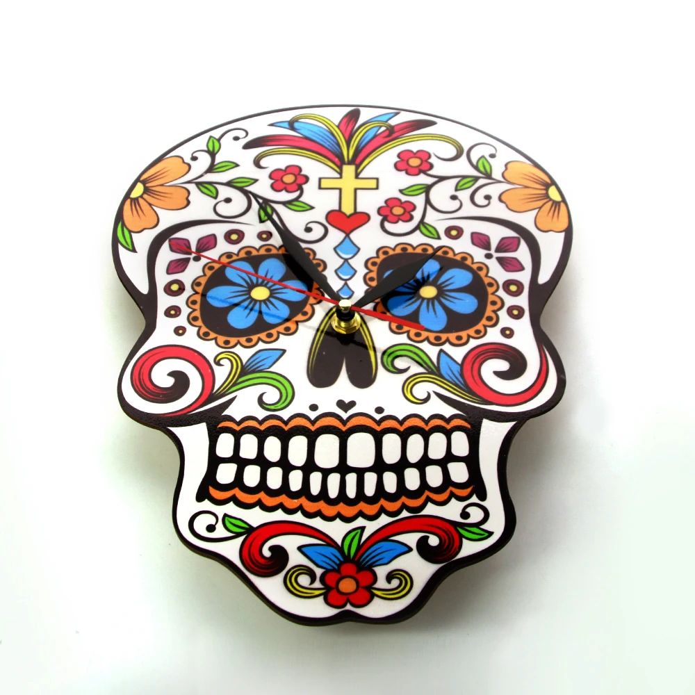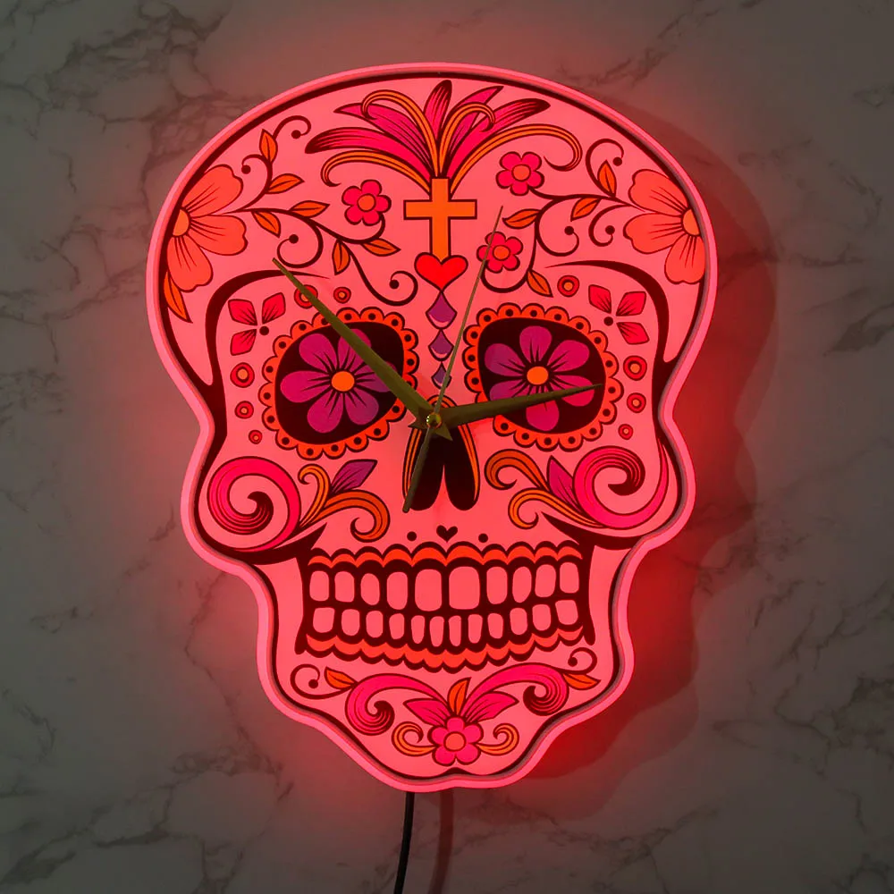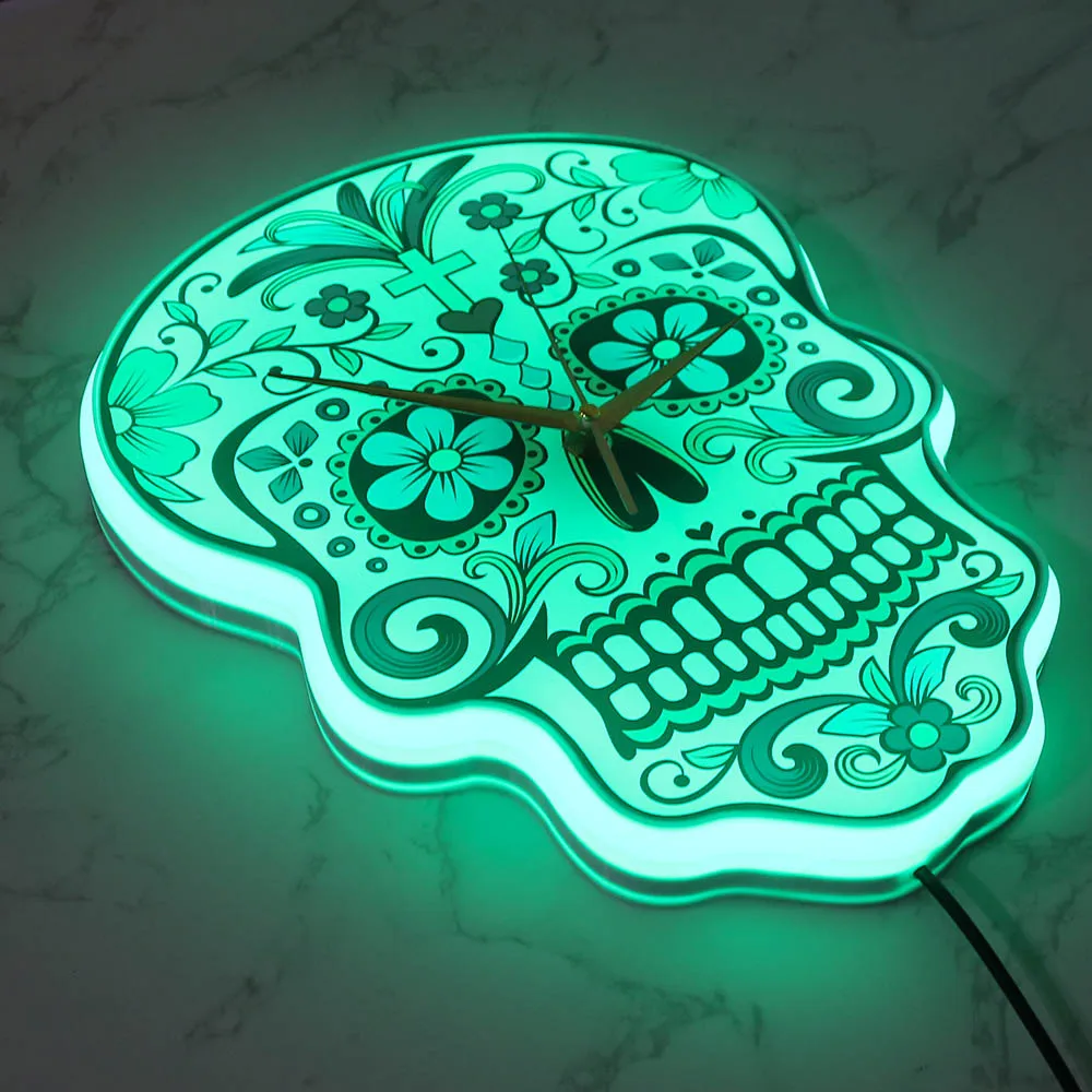 Become inspired by the Mexican Culture by featuring this Beautiful Sugar Skull Dia De Los Muertos wall clock in your home. Set on an acrylic laser engraved looking background, this colorful Day of the Dead reloj features a vibrant floral sugar skull image as the clock face.