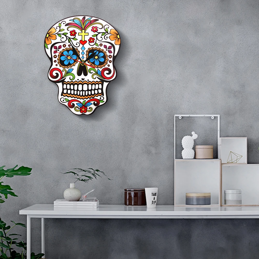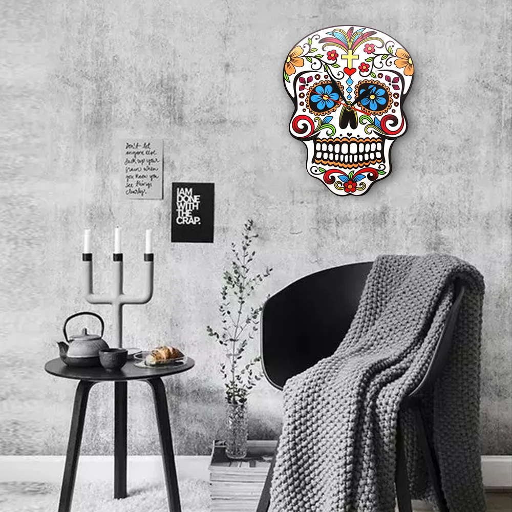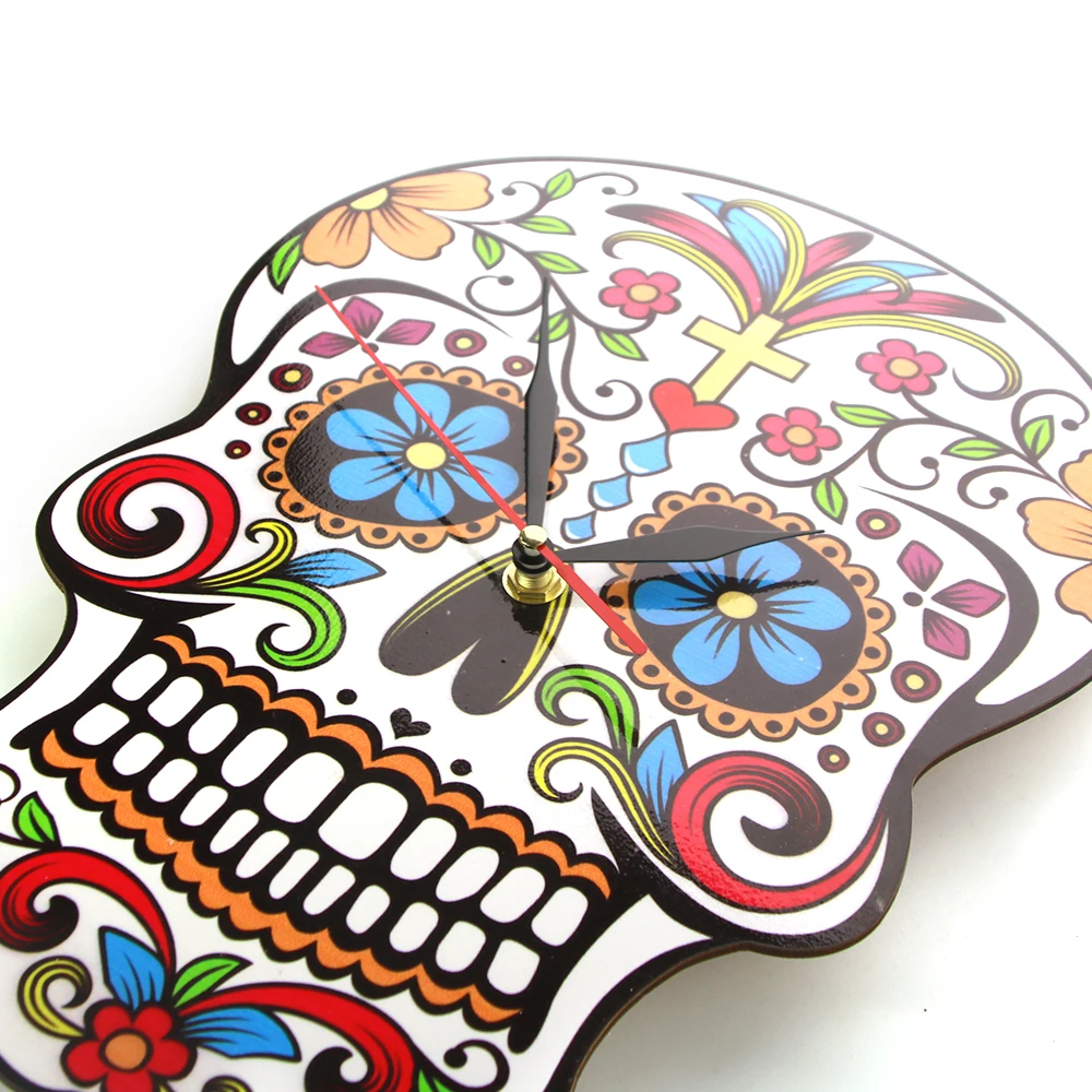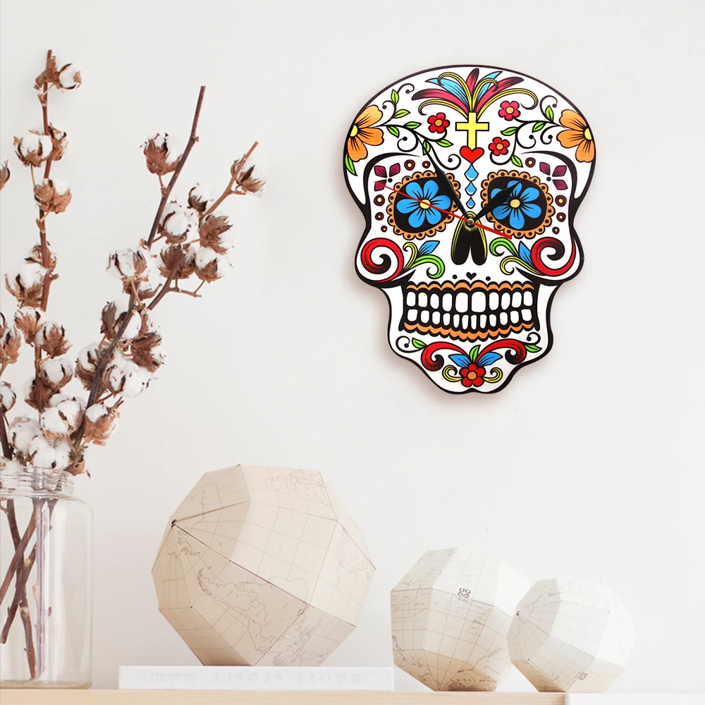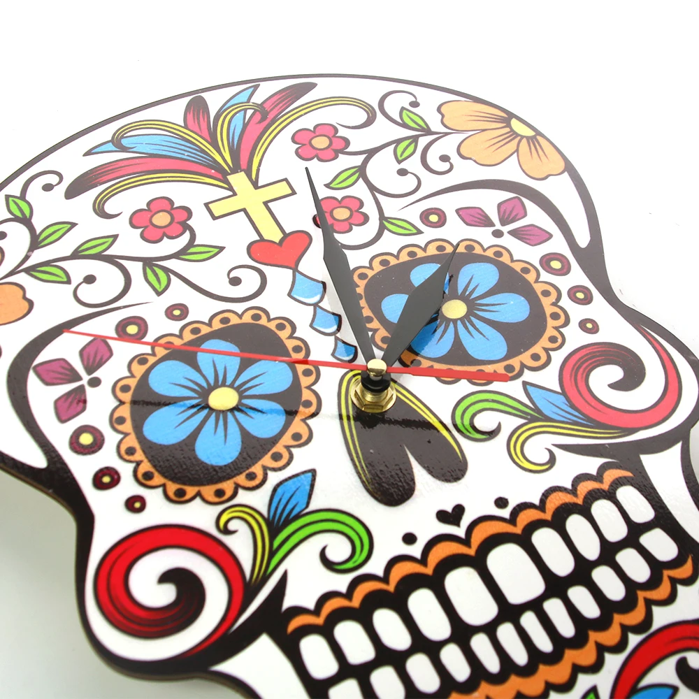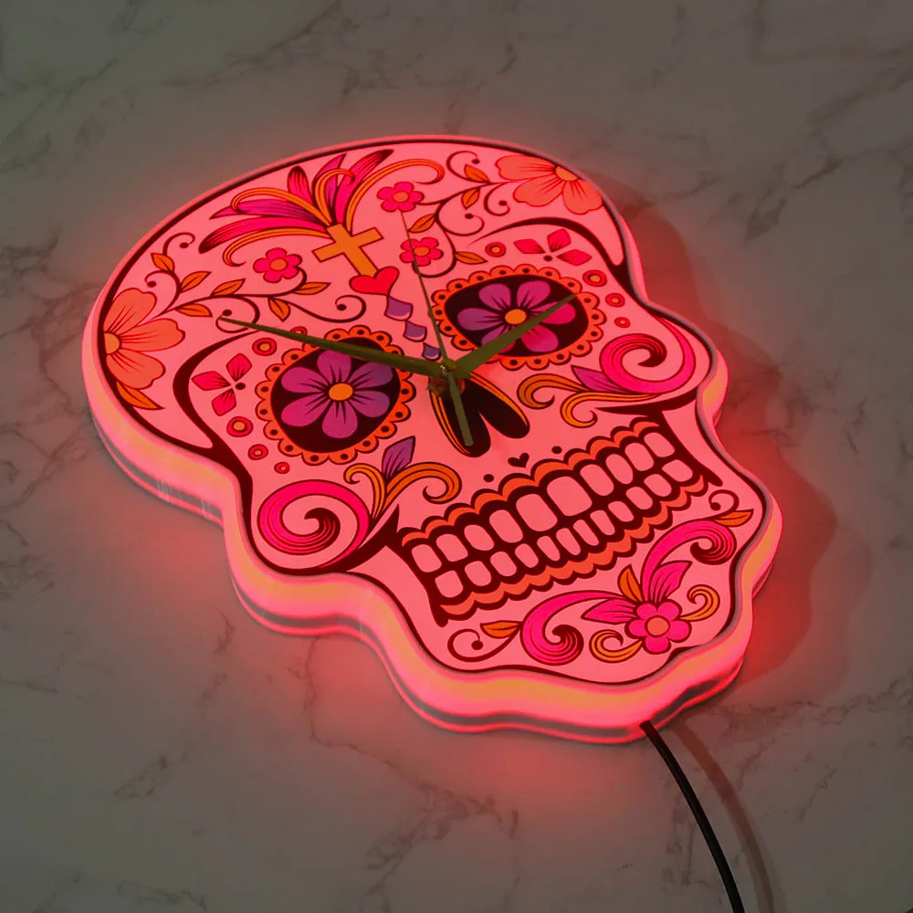 Become inspired by the Mexican Culture by featuring this Beautiful Sugar Skull Dia De Los Muertos wall clock in your home. Set on an acrylic laser engraved looking background, this colorful Day of the Dead reloj features a vibrant floral sugar skull image as the clock face.